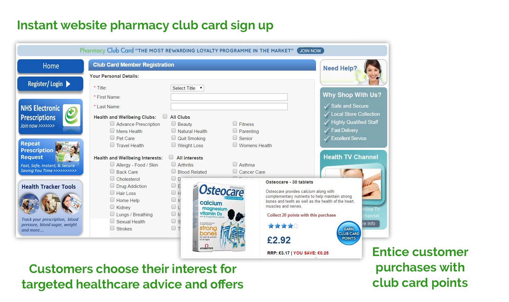 Our Loyalty Card online marketing and sign up software is integrated into all of your pharmacy websites. This service entices online shoppers to take action and join the loyalty programme during their internet shopping journey at various stages.